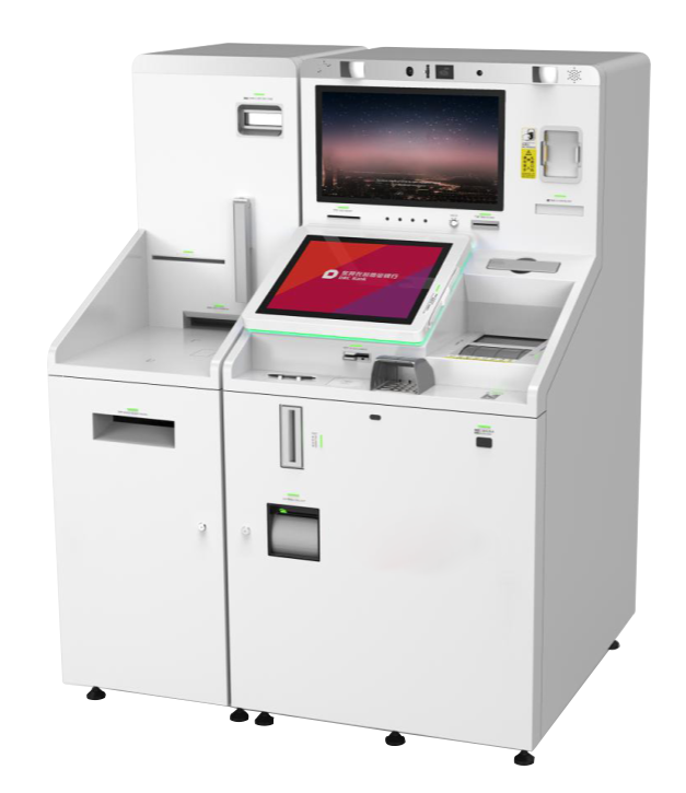 | ★产品参数 主板 CPU:Intel 酷睿i系列处理器。 内存:8 G。 硬盘:1T。 2个千兆网卡。 操作屏(电磁电容屏) 19寸电磁电容一体屏(支持10点触摸),支持书写和签名功能。 视频对话屏 21.5寸液晶显示屏。 密码键盘 标准EPP硬加密金属小键盘(16键),支持盲文提示,支持国密算法和DES加密。 读卡器模块 支持电动读取磁条卡读取、IC卡读写功能,符合《中国金融集成电路(IC)卡规范》2.0版本。 磁条读取模块 支持存折和银行卡1、2、3轨磁卡阅读;存折的磁条标准:DIN/ISO、ANSI、ISO7810/7811/7813等。 非接触IC卡读取模块 认证要求:通过PBOC3.0,EMV Level1标准认证。 读卡距离:0-50mm。 吸入式身份证阅读模块 支持二/三代身份证扫描读取。 热敏打印机 纸宽:80mm。 纸卷直径:150mm。 自动切纸,打印速度大于150mm/s。 条码阅读器 支持一维码和二维码扫描功能。 指纹仪 支持普通柜员指纹和公安部指纹。 现金模块 独立双闸门,钞口容量500张,支持连续入钞,出钞口容量200张,支持全面额。 钞箱 具备3个循环箱、1个分隔钞箱、1个废钞\回收箱,单个循环钞箱容量为3400张。 保险柜 保柜符合CCC、UL 291安全标准,有认证证书及公安部检测报告,配置一个机械锁和电子密码锁。 扎把机 适用新旧版人民币0.1-100元面额和各种外币纸币。捆扎张数:100张。 动态密码锁 支持对接行方动态密码锁管理系统,使用双人指纹加短信验证码开锁。 存折补登模块 支持读取存折磁条信息 和 支持打印存折、存单、证书、票据、凭证、证件、单页纸、连续纸。 票据出售模块 具有支票票据文字打印、图像打印(200DPI)和入纸重张检测等功能,支持不同规格格票据入纸。 票据处理模块 支持正反面彩色、灰度、黑白、紫外、红外图像存储箱:票箱带锁,容量200张。 回单打印机 黑白激光打印。打印速度:≥45ppm(A4)。 纸盒数量:≥3个。 单个纸盒容量:≥ 550张。 摄像头 支持人脸摄像头,现场环境全景摄像头,出入钞口摄像头,摄像头角度可调节。 扬声器 支持音量调节功能,最低支持2.0声道。 麦克风 内置式声音收集设备,采集业务操作区域声音信息。 |